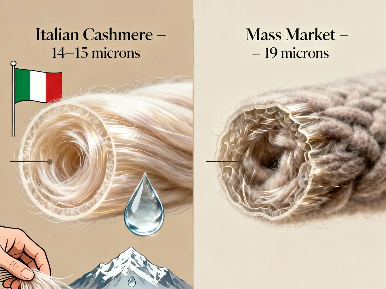 Fiber diameter directly affects softness. 14-micron feels noticeably softer and more luxurious than 19-micron. Top Italian cashmere brands use only 14-15 micron fiber.