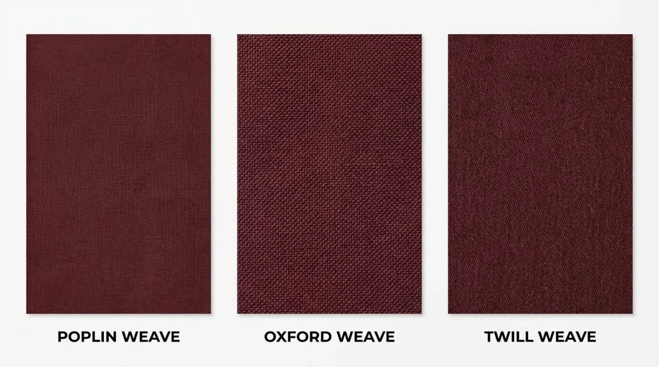 Oxford cotton has a textured weave. Thicker than poplin. Hides wrinkles better. The texture makes burgundy look deeper and richer. Good for casual business settings.