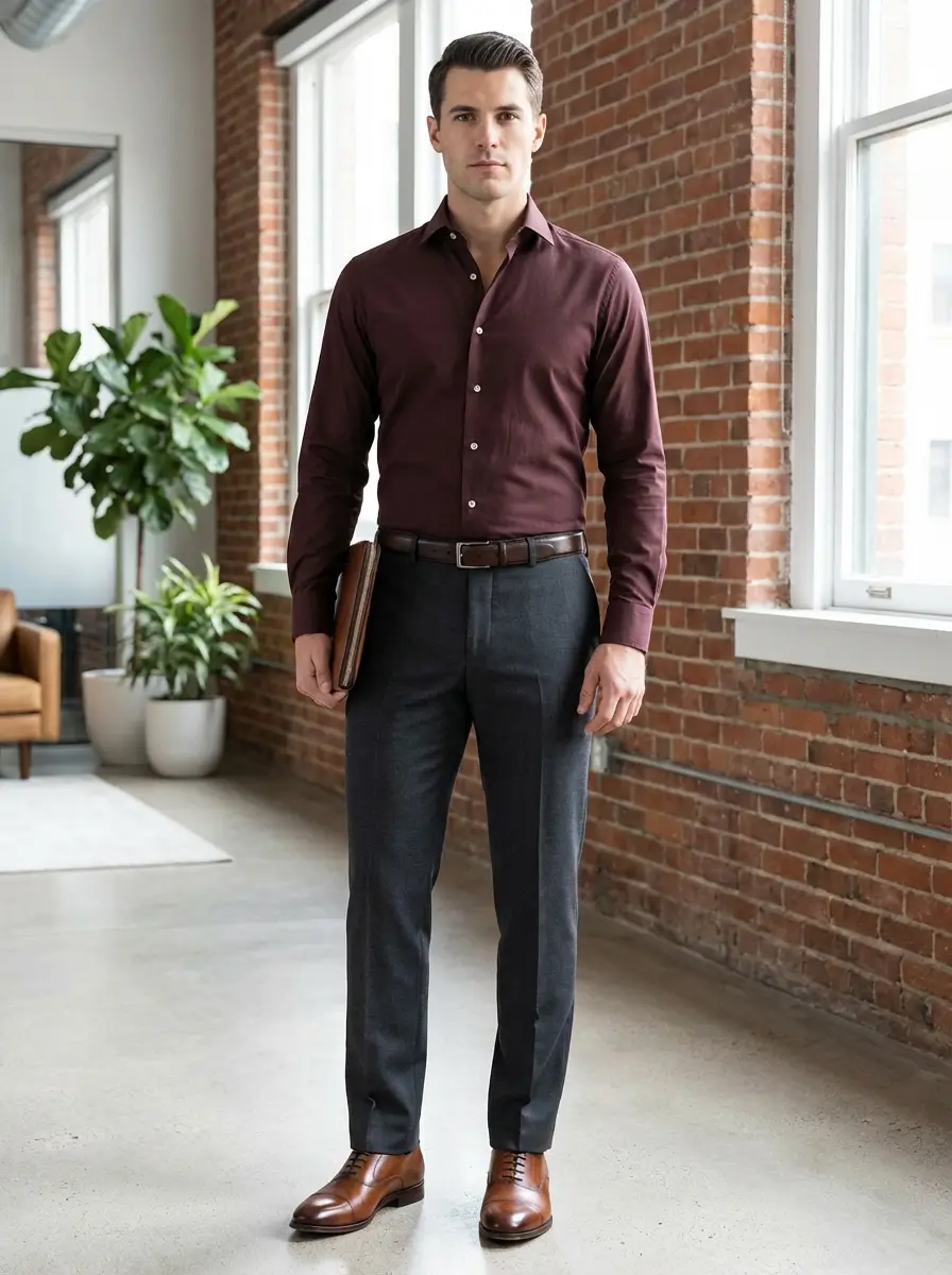 Charcoal gray pants are your safest choice. The neutral gray lets burgundy do its job without competing. Dark charcoal works for business. Light charcoal works for casual Friday. Medium gray works for everything between.