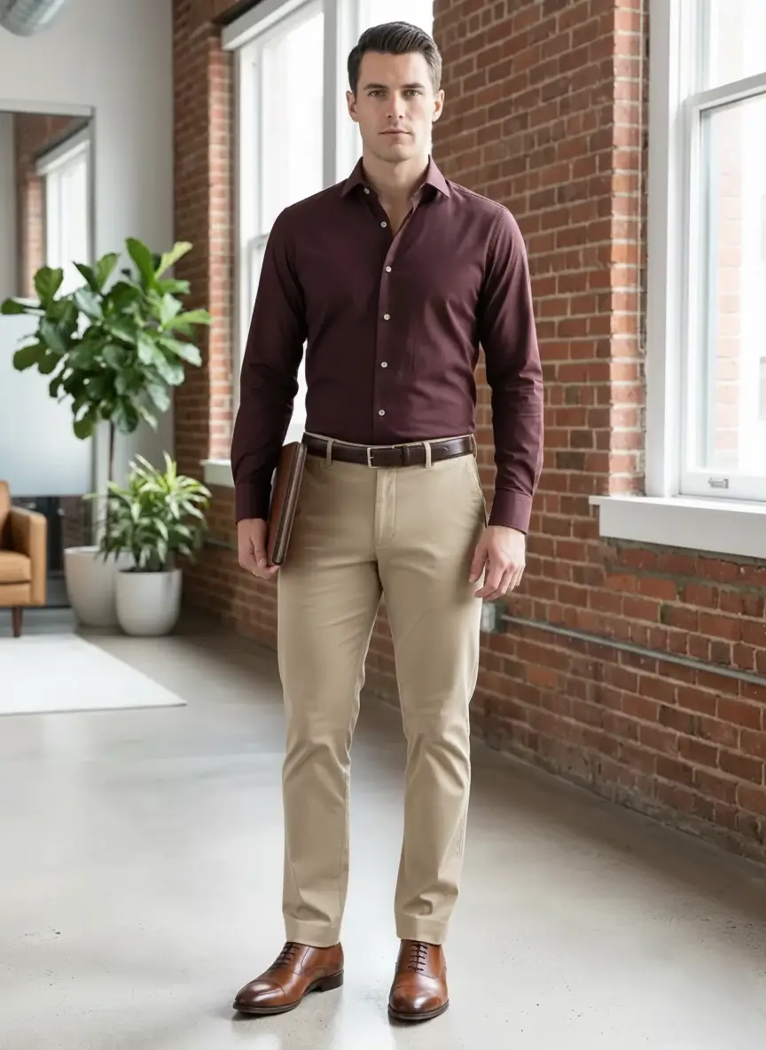 Khaki and tan work if you keep the shirt tucked and add a belt. The warm brown undertones in burgundy match the earth tones in khaki. Skip this combination for client meetings. Save it for outdoor weddings or casual dinners.