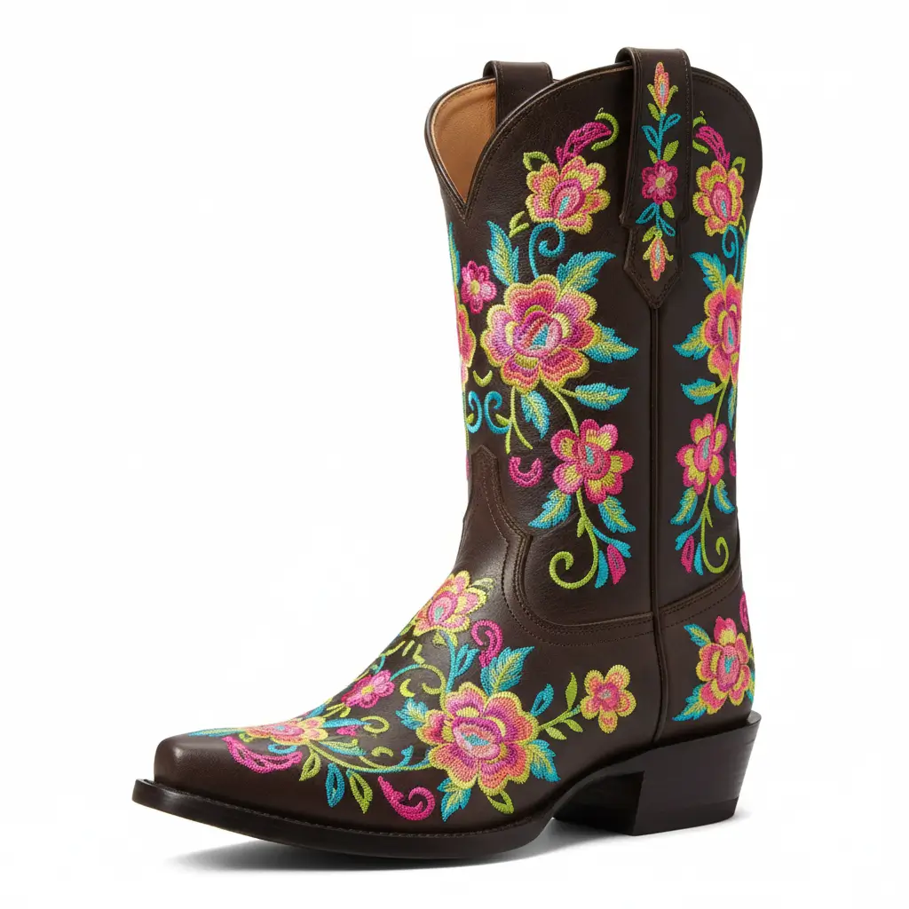 Sometimes, a boot is more than just footwear—it’s a work of art. The Donna cowboy boot by Corral is a real eye-catcher. Crafted from rich brown leather, it features intricate embroidered flowers that hold a special significance: they glow under black light.
